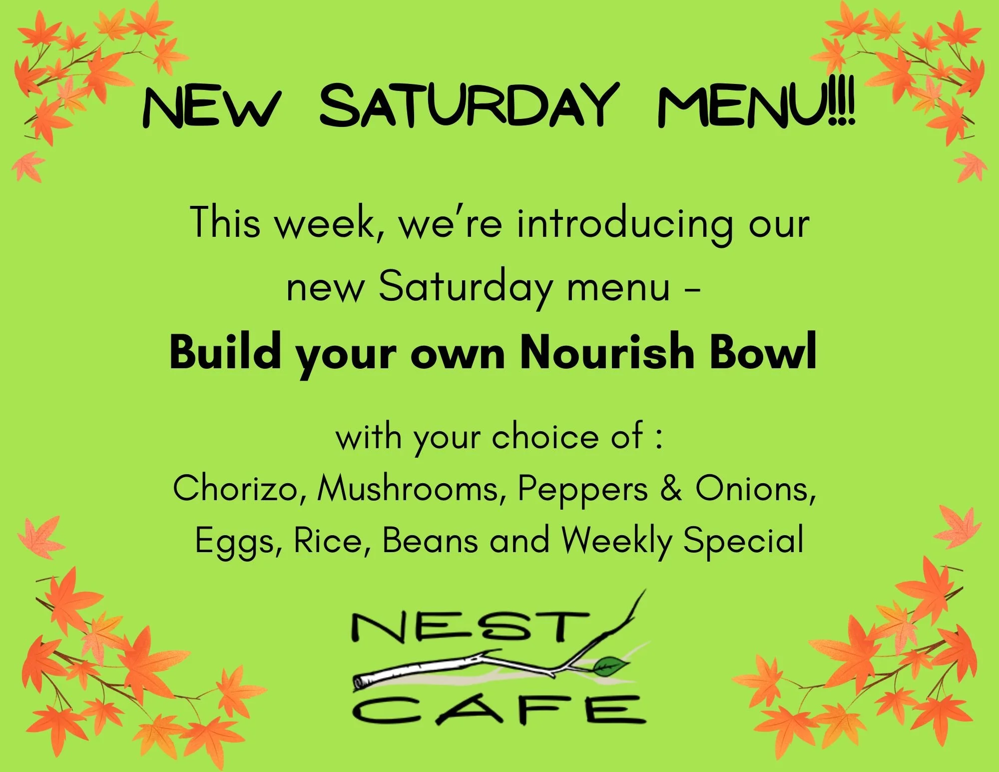 NEST Cafe’s menu changes daily to accommodate local, seasonal produce. Vegan, Vegetarian, and Gluten-free options are available.