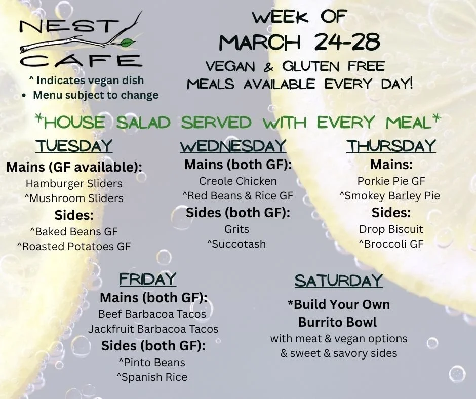 Week of March 24-28 menu. Choose between 2 entrees, 2 sides, plus salad and dessert. 1 entre and side are always vegan. Gluten free options are always available. *GF indicates gluten-free. GFA indicates gluten-free available.